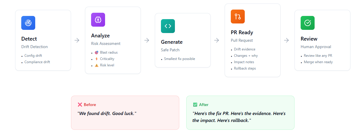 Turn drift fixes into PRs with evidence + rollback steps, and automate the decisioning for low-risk changes.